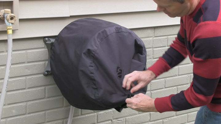 For more info on ELEY garden hose reel cover installation watch our short video demonstrating the proper positioning and placement with instructions to ensure your cover will protect your ELEY hose reel and garden hose: Installing Your ELEY Hose Reel Cover