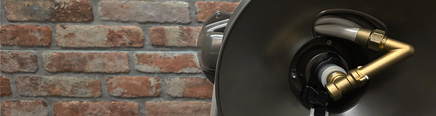 The entire plumbing of all ELEY hose reels consists of just two components: 1) the inlet hose and 2) the brass-aluminum-copper swivel. The inlet hose is made of 100% virgin polyurethane approved for food contact and does not contain lead, phthalates, or BPA (bisphenol A). The fittings are made from lead-free brass, as is the brass in the swivel. All materials that come in contact with water are made from drinking water-safe materials, including brass, rubber, seals, and assembly lubricants.