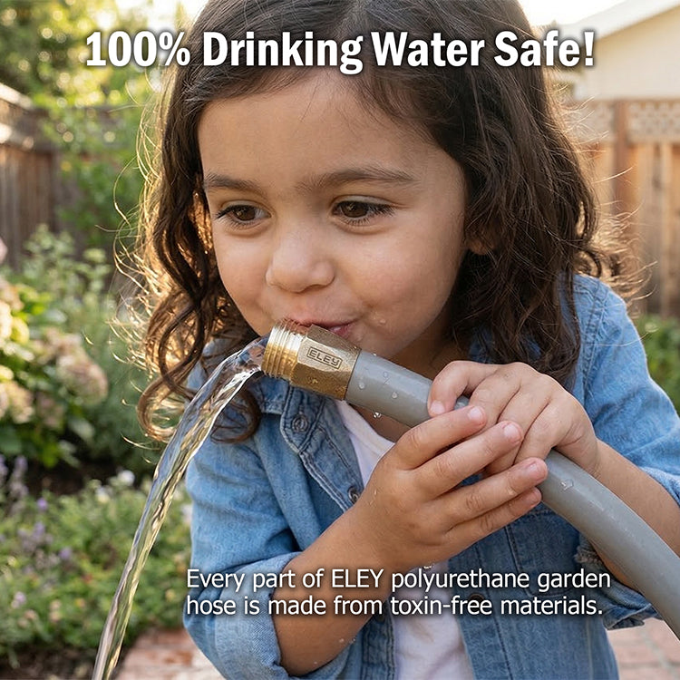 ELEY garden hose is made from UV-stabilized FDA and NSF grade polyurethane material. Combine that with our crush-proof, lead-free machined brass fittings, and ELEY hoses are 100% drinking-water-safe. Even the rubber gaskets are made from drinking-water safe material. For more detailed information, see What You Need to Know About Drinking Water Safe Garden Hose.