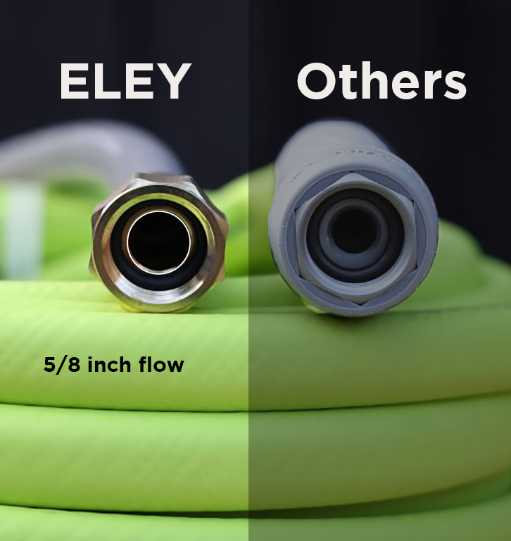 See the difference in the orifice size between traditional 5/8-inch garden hose and our FULL-FLOW fittings. ELEY fittings are slightly larger than 5/8-inch, at 0.629 inches (16 mm), while standard fittings are just under 1/2" at 0.49 inches (12.5 mm).