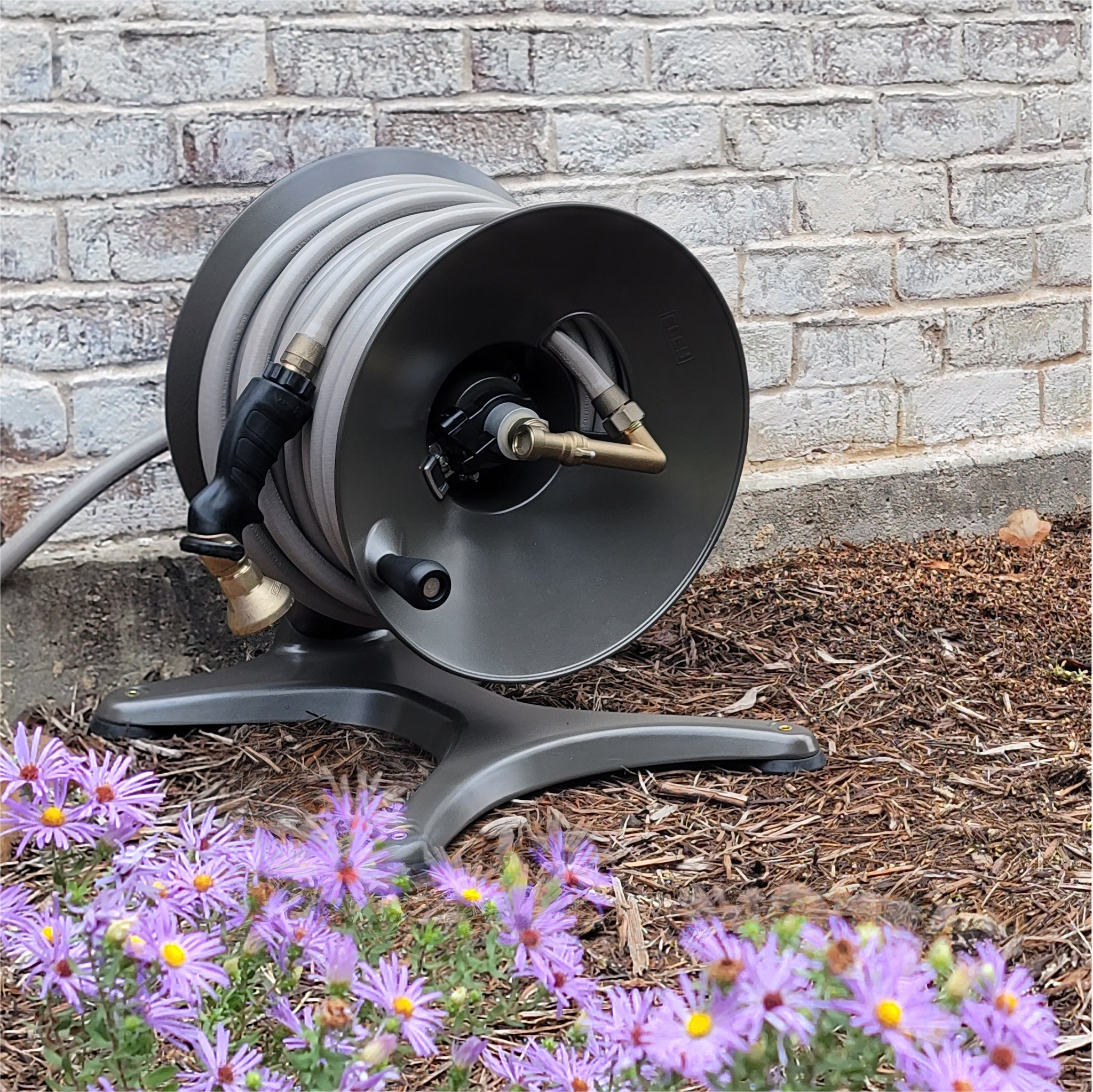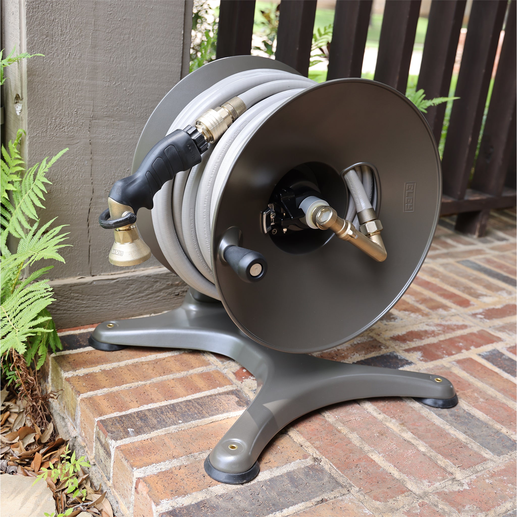 The ELEY free-standing garden hose reel was born to provide a durable and reliable alternative to the light-duty, plastic box-style garden hose reels. It's a great fit for those who don't need the portability of the larger wheeled models or for those who may not want to drill holes into their house for a wall-mount reel. The low profile makes it ideally suited for out-of-sight placement behind bushes or shrubbery. Watch this short video for a quick introduction to this versatile model.