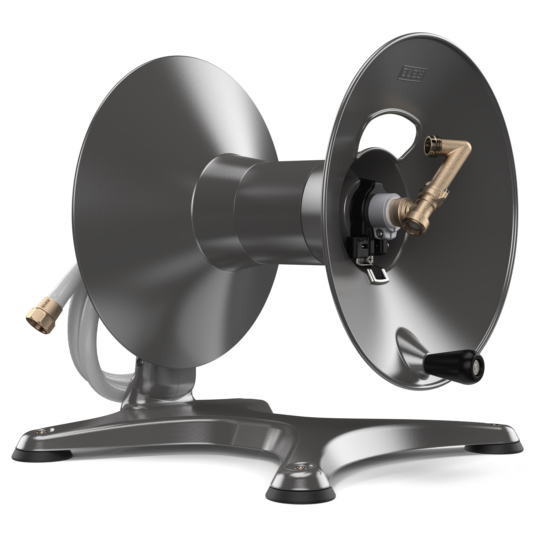 Forget about leaks. The entire plumbing on all ELEY garden hose reels consists of just two ultra-durable and drinking-water-safe components; our brass swivel (or rotary union) and our 6-1/2 foot polyurethane inlet hose (also referred to as a jumper hose). ELEY garden hose reels are backed by our industry-leading 10-Year No-Leak guarantee!