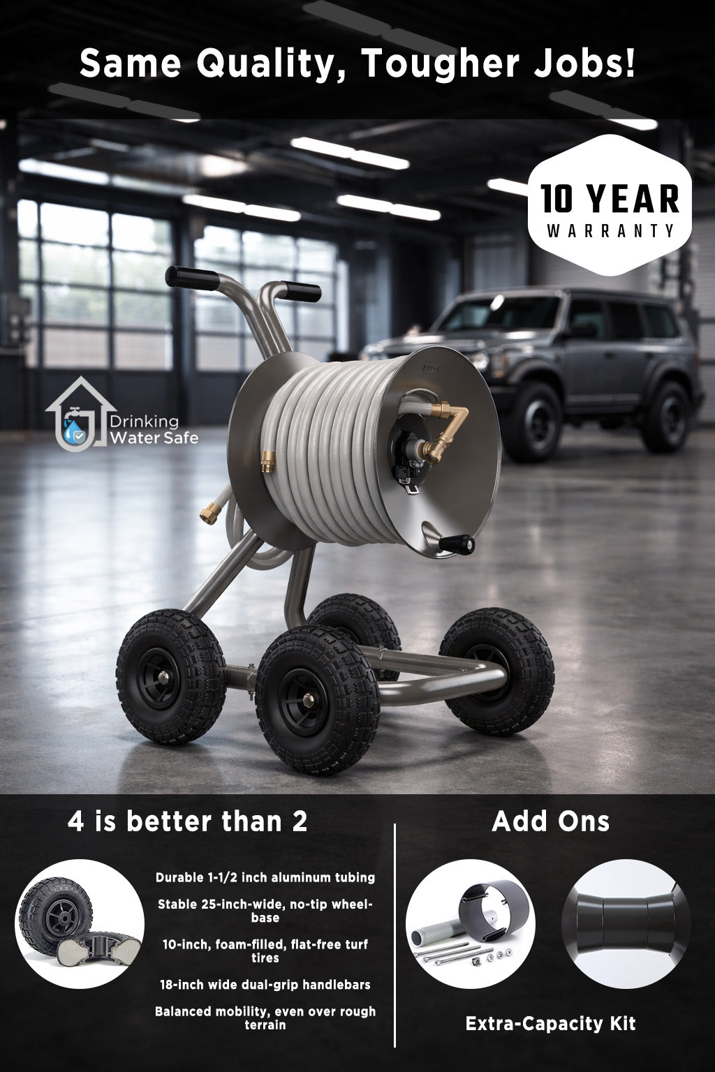 Stable, no-tip design that easily maneuvers around your property or to multiple faucets. Not sure if 2-wheel or 4-wheel is right for you? Read our 2-wheel vs 4-wheel blog.