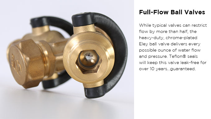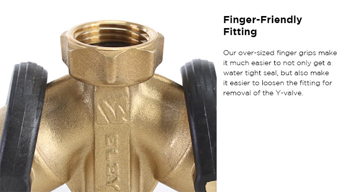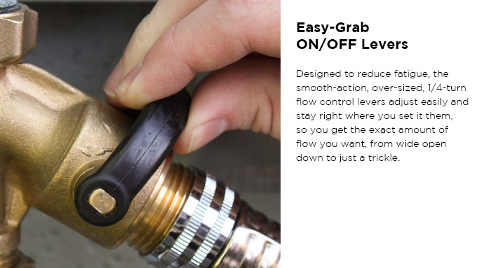 The large finger grips on the female fitting make it much easier to get a water-tight seal with the durable O-ring gasket and to loosen the fitting to remove the Y-valve from the faucet. The oversized, 1/4-turn, "Stay-Put" flow control levers are easy to grab and adjust and stay right where you set them for precise water flow control. Ultra-durable and maintenance-free Teflon® seals keep the ball valves operating smoothly and leak-free for over ten years, guaranteed.
