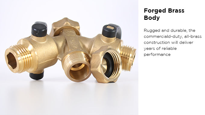 The main body of this beefy splitter is fabricated from forged, drinking water-safe lead-free brass. This durable, thick, and rugged material will deliver years of reliable performance. The heavy-duty interior ball is made from durable chrome-plated brass. The easy-grab ON/OFF flow control lever is formed from a high-impact resin material and the long-life O-ring washer in the female fitting is made from ultra-strong and chemical-resistant polyurethane material. The entire splitter is backed by our industry-leading 10-YEAR No-Leak, No-Fail Guarantee & Warranty.