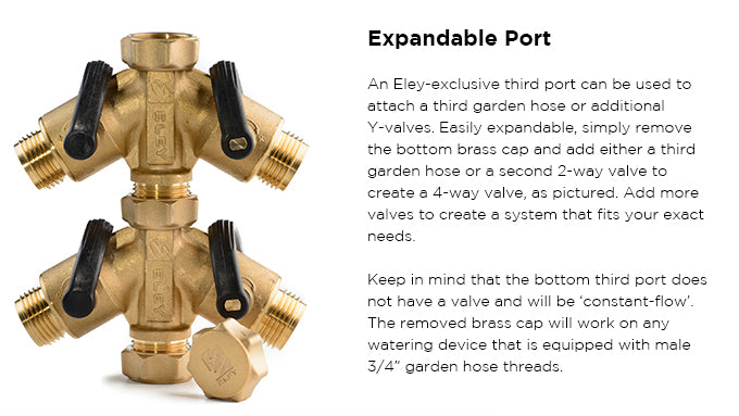 An ELEY-exclusive, the innovative and versatile third port can be used to attach a garden hose, a shut-off valve, or an additional Y-valve. To expand, remove the bottom brass cap and thread on the additional item. The bottom third port has no flow-control valve and will be "constant flow." However, if desired, the ELEY straight shut-off valve (Item #1117) can be added to create a 3rd flow-control valve. The removed brass cap can be used to cap any garden hose or watering device with male 3/4" garden hose threads.
