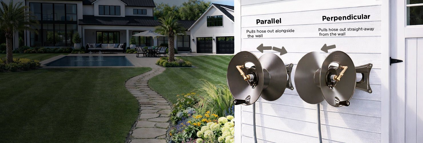 The ELEY wall-mount garden hose reel can be configured for EITHER parallel OR perpendicular. Assembled into the parallel configuration, the garden hose will pull off the reel alongside the wall, whereas the perpendicular configuration will pull the hose out straight away from the wall. You decide which configuration will work best for your application during assembly. The configuration you end up with depends on which of the two positions the reel's arm can be attached to the wall plate you choose.