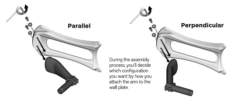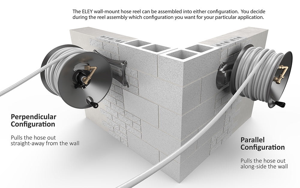 The ELEY wall-mount garden hose reel can be configured for EITHER parallel OR perpendicular.  Assembled into the parallel configuration, the garden hose will pull off the reel alongside the wall, whereas the perpendicular configuration will pull the hose out straight away from the wall.  You decide which configuration will work best for your application during assembly.  The configuration you end up with depends on which of the two positions the reel's arm can be attached to the wall plate you choose.